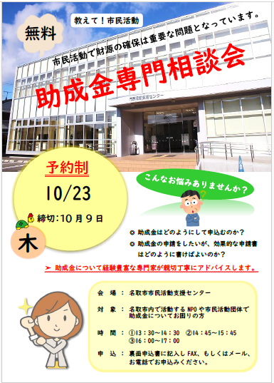 10/23(木)に「教えて!市民活動 助成金専門相談会」を開催します。