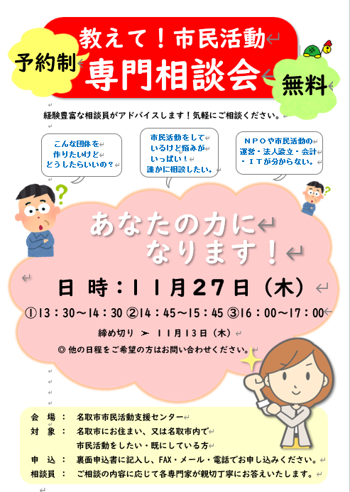 11/27(木)に「教えて!市民活動 専門相談会」を開催します。
