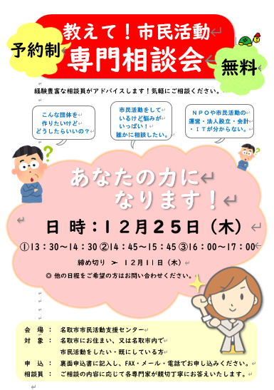 12/25(木)に「教えて!市民活動 専門相談会」を開催します。