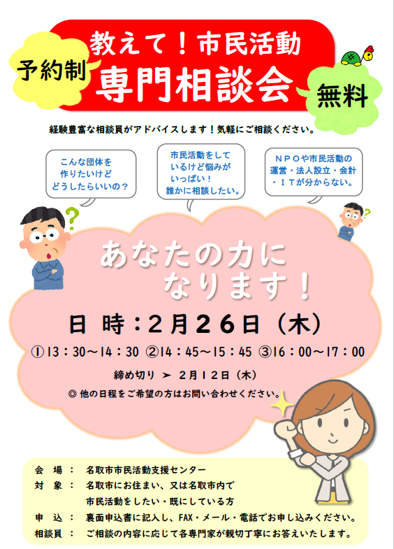 2/26(木)に「教えて!市民活動 専門相談会」を開催します。
